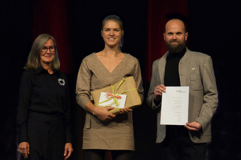 Birke Hörner, Fachsprecherin Ausbildungswesen im bdla Baden-Württemberg und Max Hansen, beide Mitglied im Vorstand, übermittelten die Glückwünsche des Vorstands und übergaben die Urkunde mit Gutschein für den mit 250 Euro dotierten Preis. Neben dem Angebot der beitragsfreien einjährigen Junioren-Schnuppermitgliedschaft gehören zum "Startpaket" in das Berufsleben die aktuellen bdla-Medien zu den Themen der Zeit, "Essentials zur Klimaanpassung", "Klimaanpassung im Städtebau", "Der Garten der Erde" sowie die Dokumentationen zum aktuellen Deutschen Landschaftsarchitektur-Preis 2025 und dem Baden-Württembergischen Landschaftsarchitektur-Preis 2022 und 2024.