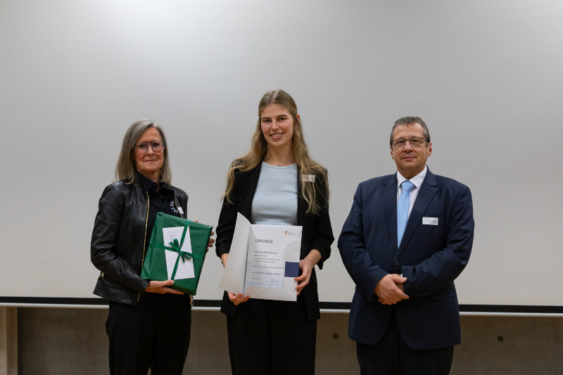 © tzamalouka, HfWU, v.l.n.r.: Birke Hörner, Sina Amelie Schopp, Prof. Dr. Andreas Frey, Rektor der HfWU