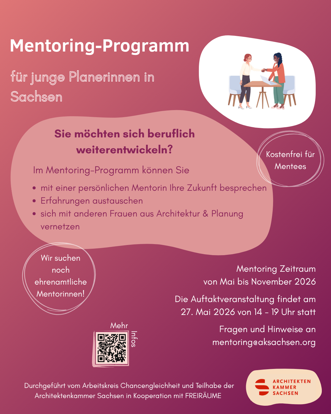 Das Mentoring-Programm der Architektenkammer Sachsen gibt Ihnen die Möglichkeit, mit Ihrer persönlichen Mentorin Erfahrungen auszutauschen und Sie in.Ihrem Vorhaben zu begleiten. Außerdem können Sie andere Frauen aus der Planungsbranche kennenlernen und sich vernetzen, um Ihr berufliches Umfeld zu erweitern und zu stärken. Willkommen sind alle Disziplinen der Planung – Architektur, Innenarchitektur, Landschaftsarchitektur und Stadtplanung.