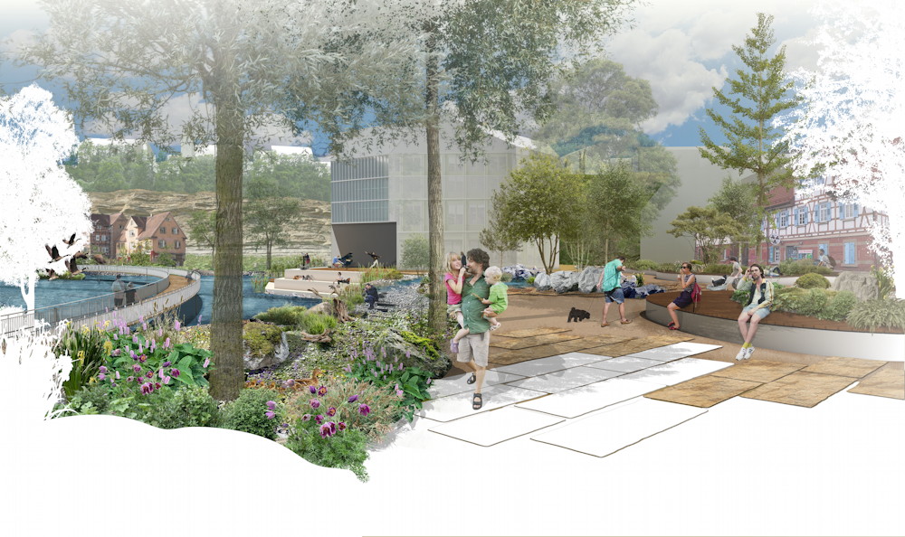 Die Arbeit untersucht das Areal anhand der drei Nachhaltigkeitsdimensionen Ökologie, Ökonomie und Soziales und identifiziert fünf zentrale Herausforderungen: die baulich bedingte fehlende Zugänglichkeit zum Fluss, die geringe städtebauliche Sichtbarkeit des Quartiers, die hohe Versiegelung ehemaliger Industrie- und Parkplatzflächen, die Hochwassergefährdung sowie die verlorene Flussidentität Backnangs. Das daraus entwickelte Konzept vernetzt die Murr als zentralen Wasser-Nervenstrang mit einem peripheren sichtbaren Wasserleitsystem im Außenraum. Wie in einem Nervensystem werden an wichtigen Knotenpunkten im Projektgebiet Wassersysteme für Retention, Kühlung und Bewässerung zu „funktionalen Cortexen“ verknüpft, an denen urbane Hauptfunktionen wie Wohnen, Arbeiten, Versorgen und Erholen organisiert werden. So entsteht eine enge, klimawirksame Verschränkung zwischen Wasser und Stadt, die die historische Beziehung Backnangs zum Fluss erneuert. Eine zum Flussraum orientierte Bebauungsstruktur erhöht die Präsenz der Murr im Stadtbild, während neue Wegeverbindungen das Gebiet öffnen und an die umliegenden Quartiere anbinden. In der Flussschleife werden versiegelte Parkflächen umfassend entsiegelt und zu Retentionsräumen umgestaltet, sodass eine selbstdynamische Schwemmlandschaft entsteht, die sowohl dem Hochwasserschutz dient als auch die Ökosysteme stärkt.